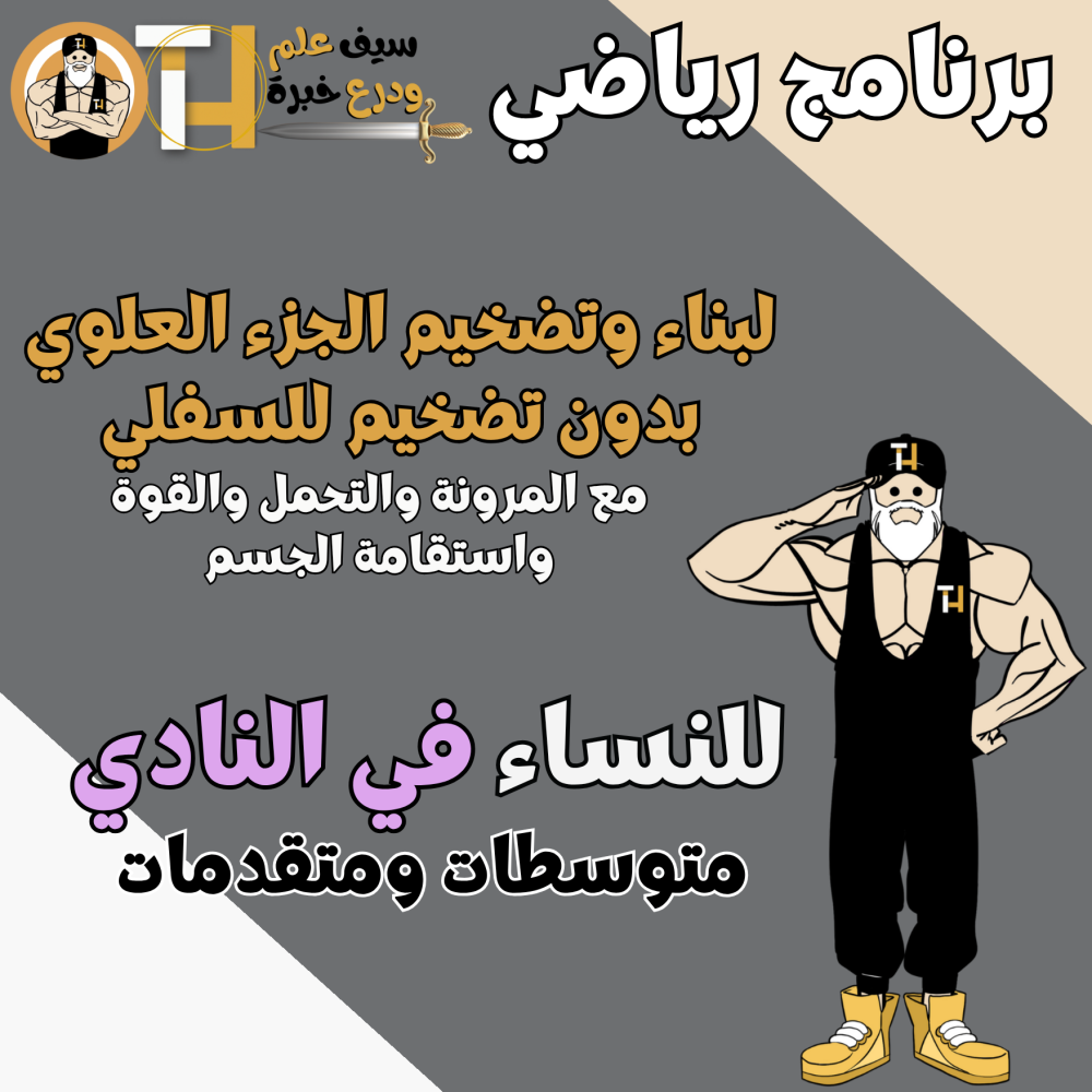 ملف رياضي فقط للبنات في النادي. نظام تدريبي لبناء وتضخيم عضلات الجزء العلوي بدون تضخيم لعضلات الجزء السفلي، مع الشد والتقوية والمرونة وتحسين وضعية واستقامة الجسم، معلومات شاملة وكاملة، نصائح، توجيهات، جدول تمارين شامل للجلسات والتكرارات وأوقات الراحة، وكل تمرين له فيديو أساسي وله أيضًا بدائل، بعدد أيام تمرين ٣ أو ٤ أو ٥ أيام حسب الإختيار، بالإضافة إلى جدول تتبع التقدم.